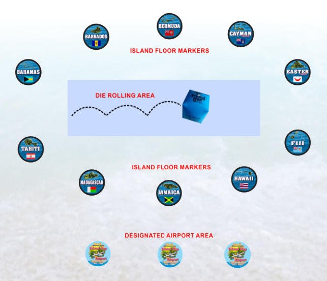 You also need a designated area for the (3) three Island Hop Airport Markers, (Skip 3 Turns, Skip 2 Turns, and Skip 1 Turn). Allow generous space between markers so no one is “floating around in
